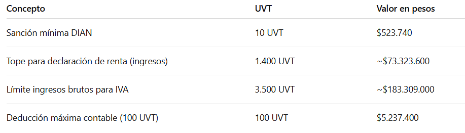 Estos valores son ejemplos de cómo la UVT se traduce directamente en cifras en pesos para distintos procesos fiscales en Colombia.